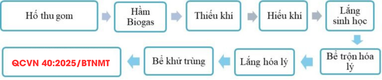 Sơ đồ tổng quan thường bao gồm: Hố thu gom → Hầm Biogas (kỵ khí) → Bể thiếu khí → Bể hiếu khí → Lắng sinh học → Bể trộn hóa lý → Bể lắng hóa lý → Bể khử trùng.