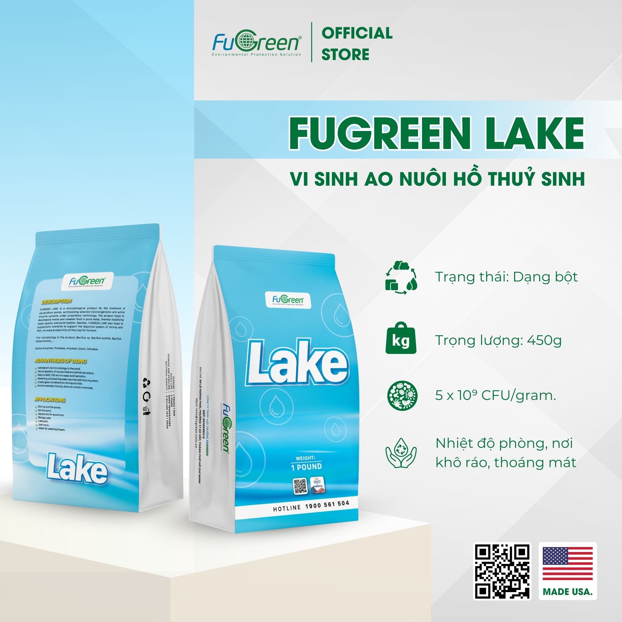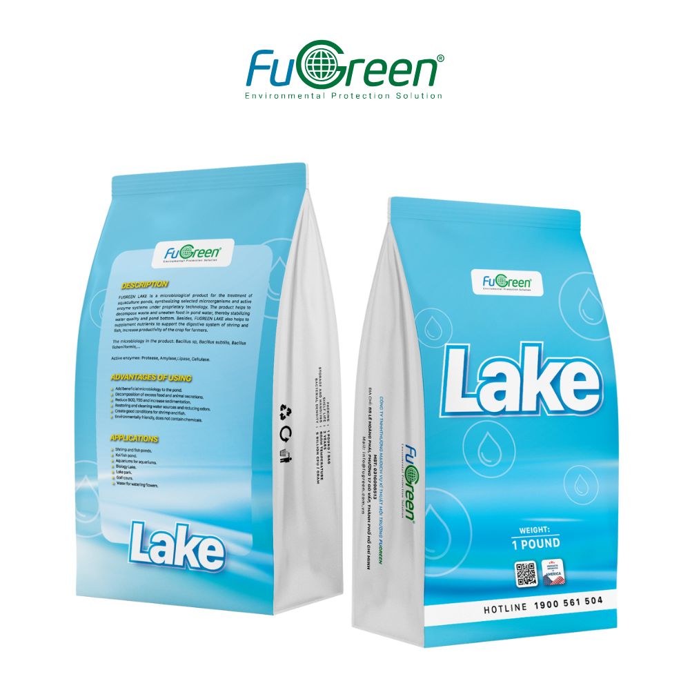 Fugreen Lake là sản phẩm hiệu lực cao, mật độ vi sinh cao, dạng bột được chọn lọc đặc biệt để tăng khả năng tiêu hóa chất thải dư thừa, xử lý tảo và làm sạch ao nuôi thông qua cơ chế cạnh tranh thức ăn trong nước. Ngoài ra, sản phẩm còn có thêm chất phụ gia và vi sinh xử lý nước ao nuôi nhằm kích thích tăng trưởng của tôm và cá.